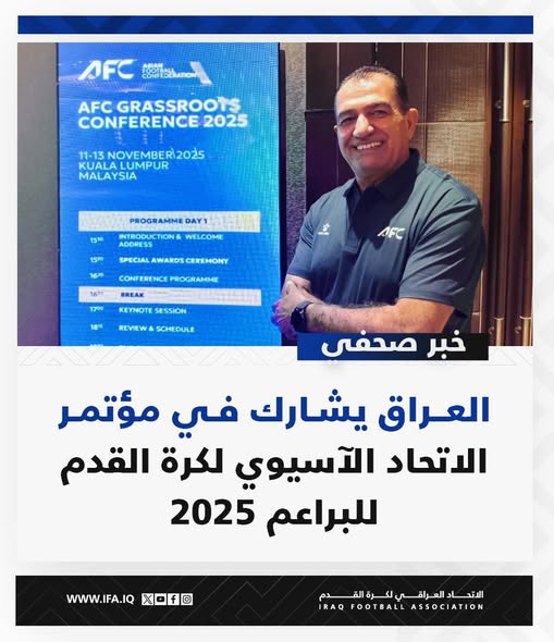 وذكر بيان للاتحاد، تلقته وكالة الأنباء العراقية (المستقلة)، أن "العراق شارك في مؤتمر الاتحادِ الآسيويِ لكرةِ القدم للبراعم 2025 الذي أقيمَ في العاصمةِ الماليزية كوالالمبور، اذ مثّل العراق المديرُ الفنيّ كارلوس رودريغز، ومدير قسم البراعم والأكاديميات الكرويّة سعد عبد الرحيم